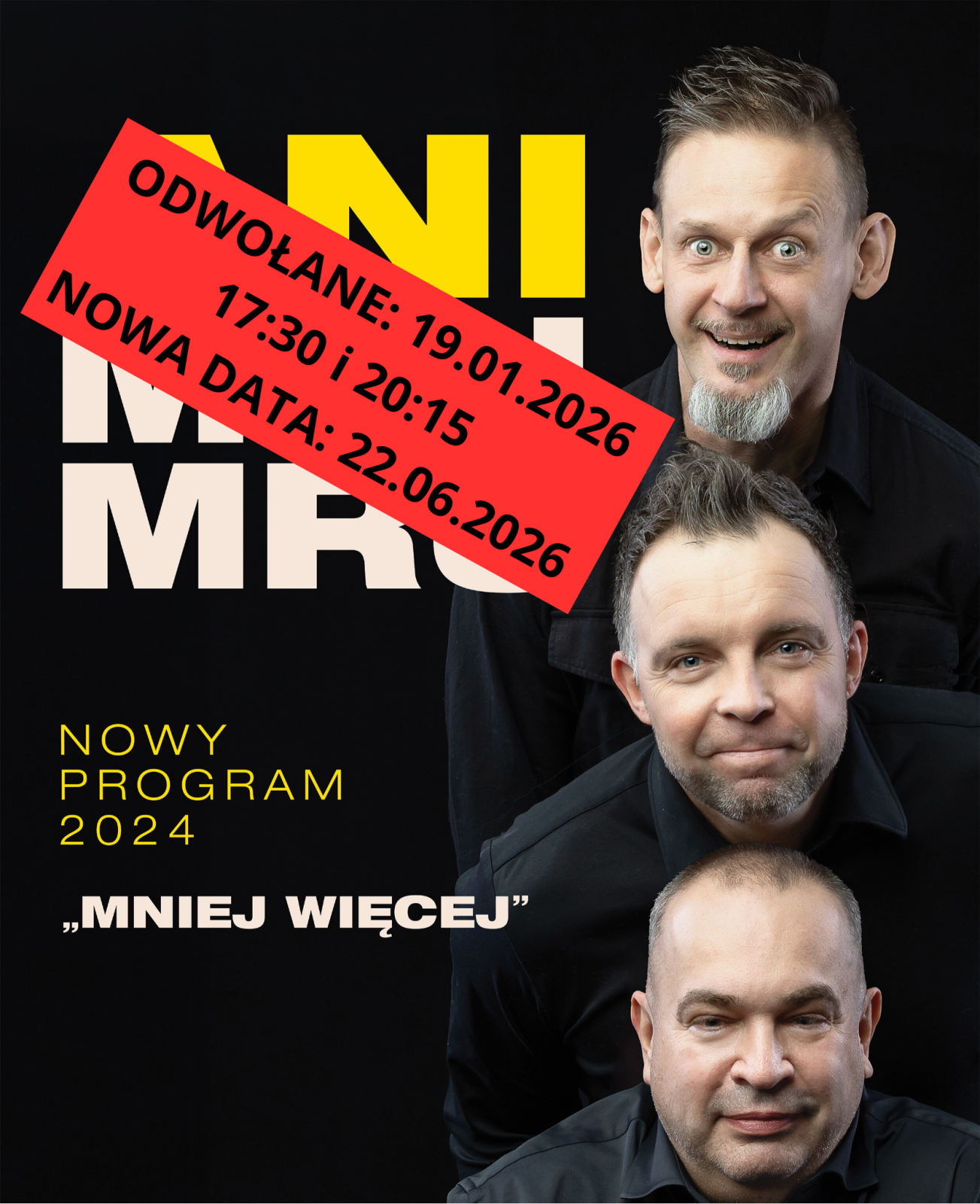 Informujemy, że występy grupy „Ani Mru Mru”, które były zaplanowane na poniedziałek 19.01.2026 r. na godz. 17:30 i 20:15 zostają odwołane. Nowa data dwóch występów to 22.06.2026 r. godz. 17:30 i 20:15 Bilety zakupione i zarezerwowane nie tracą ważności. W razie zwrotów prosimy o kontakt z kasą teatru pod nr tel 75 64 28 120 […]